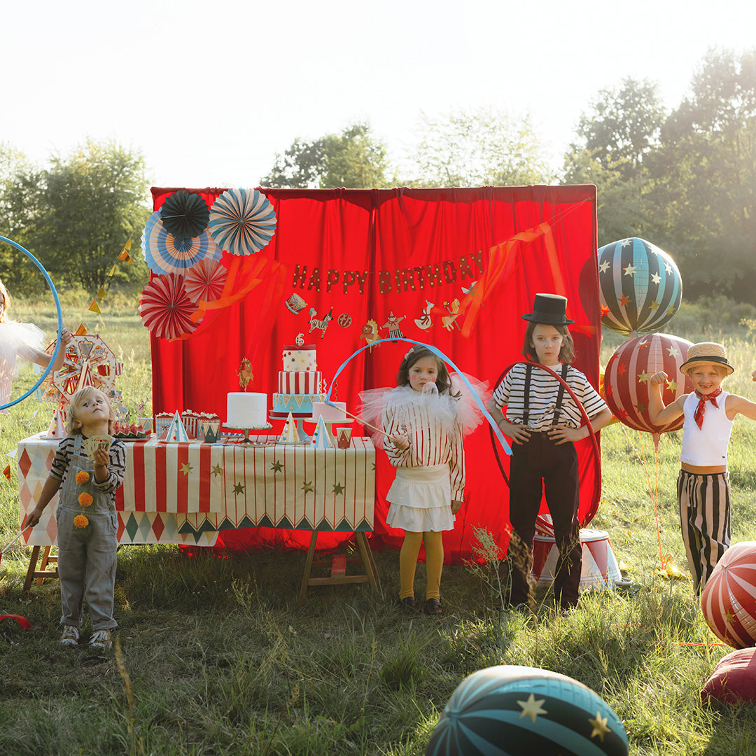 Maak van de verjaardag van je kind een onvergetelijke show met deze nieuwe feestcollectie 'Welcome to the Circus'. Boordevol vrolijke kleuren en speelse patronen is dit een uniek en sprankelend thema waar kinderen dol op zijn. Laat de kleine artiesten schitteren als echte circushelden: van grappige clowns en dappere leeuwentemmers tot spectaculaire acrobaten die applaus verdienen. Dit feestje wordt gegarandeerd een spectaculaire show waar iedereen nog lang over zal napraten! 🎪✨